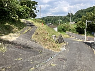 自動車参道があるので上まで車で行くことは、他所からの参詣者が通っていいならば可能でしょう。分かれてからは細い道です。写真右に細く見える道(実際は広い道)は神社社頭から150メートルくらい西へ進んだ辺りです。